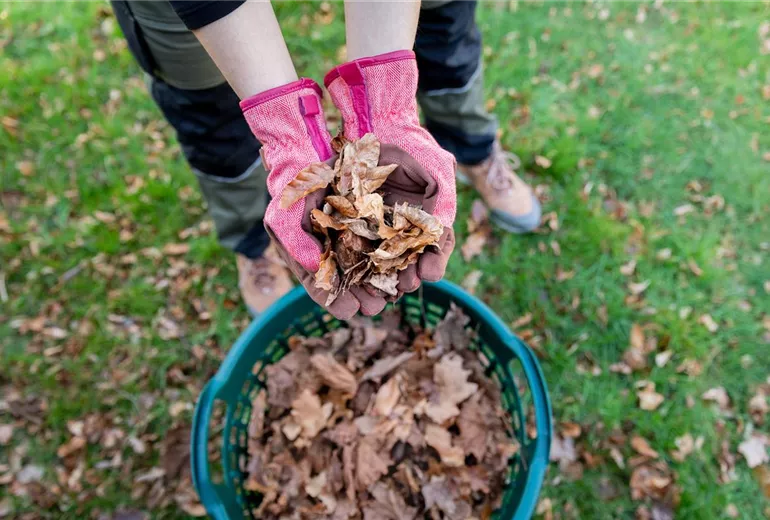 Wenn es darum geht, den Garten winterfest zu machen, spielt Laub eine große Rolle. Viele Gartenbesitzer haben große Bäume rund um den Garten stehen, die im Herbst ihr Laub fallen lassen. Vor allem auf dem Rasen sollte man dann aufpassen, denn das Laub muss vor dem Winter weg. Zum Garten winterfest machen gehört dann, den Rasen das letzte Mal zu mähen und das Laub zu entfernen. Genutzt werden kann das Laub als Winterschutz für Rosen, Beete und Kübelpflanzen. Dafür wird das Laub einfach als schützende Schicht auf den Beeten verteilt oder am Stamm der Rosen angehäufelt. Außerdem kann man Laubhaufen für Igel und andere Gartenbewohner im Beet liegen lassen, die Schutz bieten und auch im Winter ein bisschen Wärme spenden. Wichtig ist dann, dass die Laubhaufen erst im Frühjahr aus den Beeten geholt und bis dahin nicht bewegt werden, damit keine Lebewesen im Laub gestört oder verletzt werden. Sobald die Temperaturen wieder steigen und keine starken Nachtfröste mehr zu erwarten sind, kann das Laub auf dem Kompost oder in der Biotonne entsorgt werden. Wichtig für die Entsorgung auf dem Kompost: Genau darauf achten, um welches Laub es sich handelt. Das Laub von Eiche, Rosskastanie oder Walnuss sollte nicht auf den Kompost. Es zersetzt sich langsam und verlangsamt die Wirkung im Kompost.