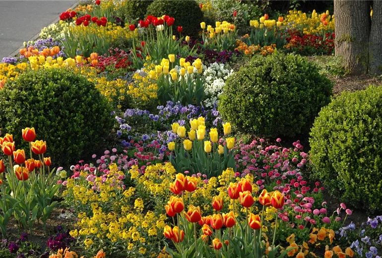 Auch unter den Laubgehölzen gibt es den ein oder anderen Kandidaten der sich gut als Begleitpflanze für Blumenzwiebeln und -knollen macht. Vor allem immergrüne Gehölze, die auch nach der Blüte der Zwiebeln und Knollen noch für Farbkleckse sorgen. So sind Kirschlorbeer, Buchsbaum und Liguster eine gute Wahl. Aber auch frühblühende Laubgehölze wie Forsythie oder Magnolie machen neben Tulpe, Narzisse und Co. eine gute Figur. Vor allem aber sollte man die Laubgehölze in den Hintergrund und die Zwiebeln und Knollen in den Vordergrund pflanzen. Denn die holzigen Kandidaten werden in der Regel viel größer und würden die Sicht auf die wunderschönen Blüten verwehren. Vorsicht bei Unterpflanzung: Sind die Laubgehölze zu groß, bekommen die Zwiebeln und Knollen zu wenig Licht. Viele Kandidaten fühlen sich aber auch im Halbschatten wohl und können daher ideal als Highlight zwischen die Gehölze gesetzt werden. Auch, aber vor allem bei Laubgehölzen als Begleitpflanzen für Blumenzwiebeln und -knollen gilt: Auf Pflanzabstände achten. Die Wurzeln der Gehölze können sehr groß werden und den kleinen Zwiebeln Konkurrenz machen.