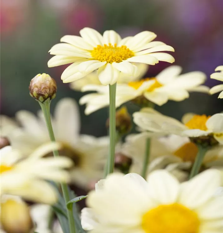 Argyranthemum frutescens, gelb bildet während der gesamten Saison zahlreiche körbchenartige, gelbe Blüten.