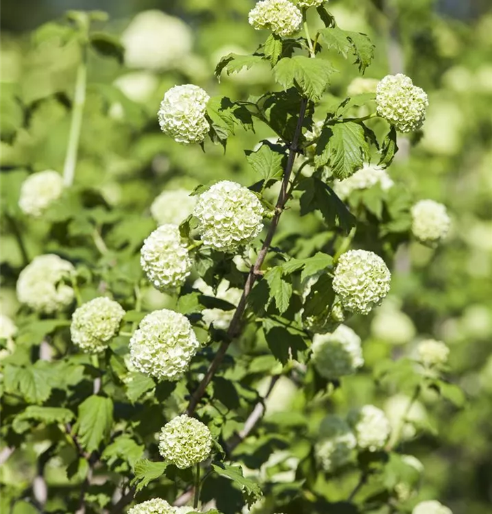 Die weißen, später rosa, gefüllten Blüten des Gewöhnlichen Schneeball 'Roseum' erscheinen in Schirmtrauben von Mai bis Juni.