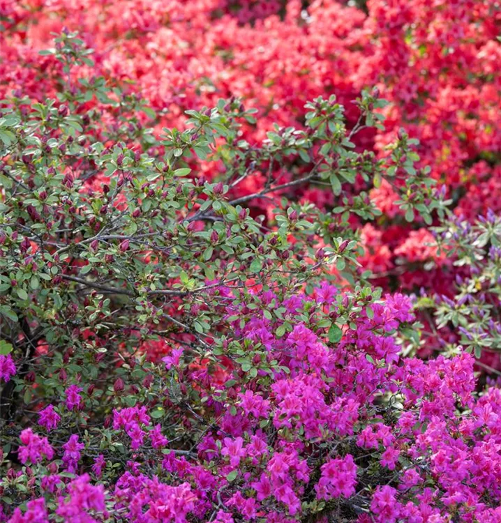 Die Japanische Azalee (Rhododendron obtusum) bringt von Mai bis Juni ein wahres Meer aus roten, rosafarbenen bis weißen Blüten hervor. Dieses aufrecht, gedrungen wachsende Gehölz erreicht gewöhnlich eine Höhe von 0,5 - 1,5 m und eine Breite von 0,5 bis 1,5 m. Ein halbschattiger (bis schattiger) Standort und ein durchlässiger, nährstoffreicher, saurer Boden schaffen optimale Bedingungen für ein gesundes Wachstum. Die Japanische Azalee ist gut frostverträglich.